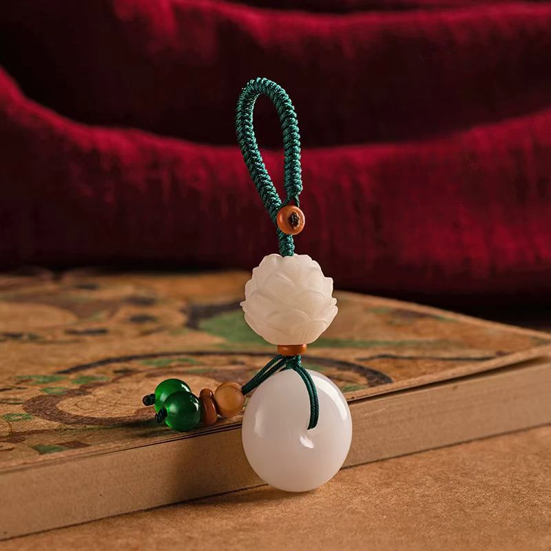 Mẫu móc ngọc khóa an toàn kết hợp họa tiết hoa sen – bồ đề được thiết kế tinh xảo, mang lại vẻ đẹp sang trọng và ý nghĩa phong thủy sâu sắc. Đây không chỉ là phụ kiện treo chìa khóa, mà còn có thể sử dụng như tượng phật treo xe ô tô mini, tạo cảm giác bình an trên mọi chuyến đi.